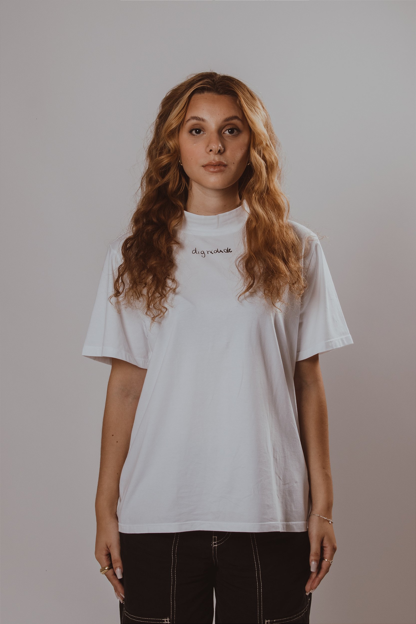 Camiseta da marca Camys com estampa desenvolvida à partir de uma atividade de desenvolvimento humano realizado durante o programa Moda para Elas, com mulheres egressas prisionais. Atividade essa que endagou as alunas a olharem para o passado com respeito e para o futuro com esperança.